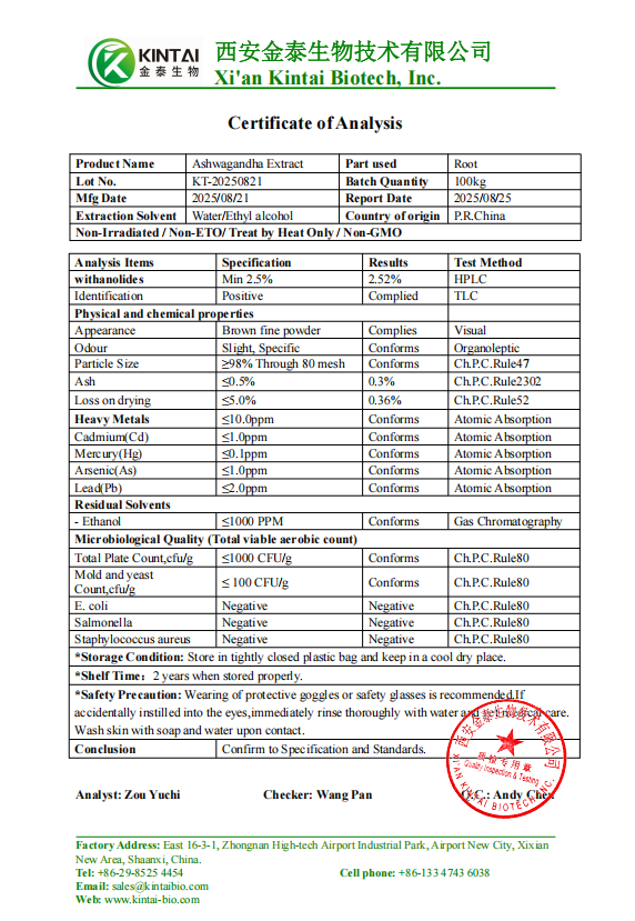 Healthkintai® is a professional manufacturer and supplier of Ashwagandha Extract Powder. We have a dedicated research and development center, production base, and state-of-the-art equipment. Our products are supported by multiple patents and quality system certifications, ensuring high standards. We offer customization options, integrated service solutions, fast delivery, and secure packaging. If you are seeking Ashwagandha Powder, please feel free to contact us at info@kintaibio.com.