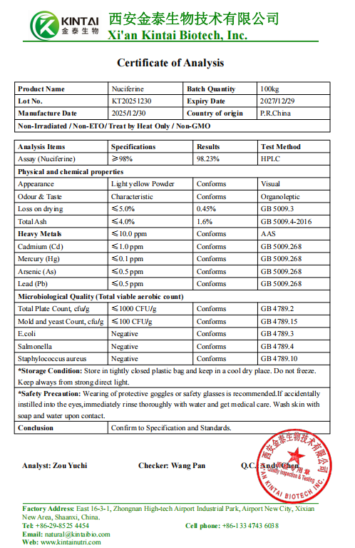 We offer standardized powder specifications with different lotus leaf alkaloid contents ranging from 2% to 98%, and can customize production and compounding according to your specific application needs, providing comprehensive support for your product development and market success.To wholesale Lotus Leaf Extract Nuciferine Powder,feel free to contact us at info@kintaibio.com.