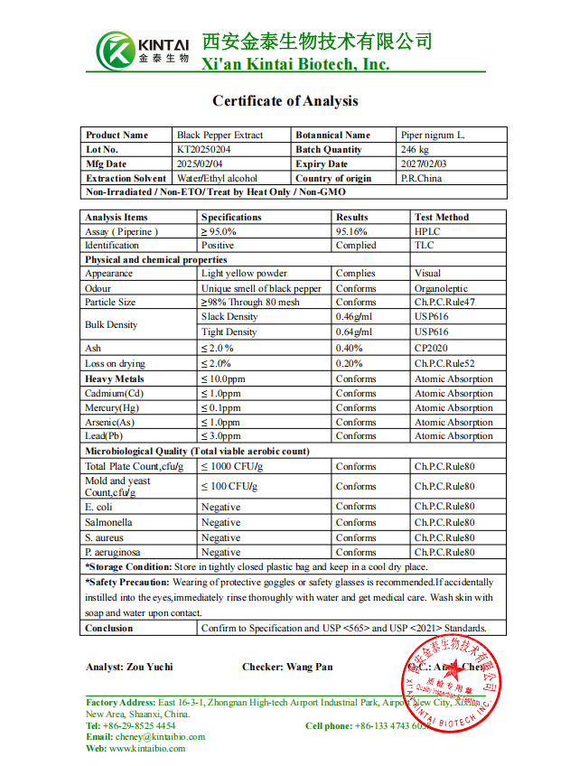 As a source factory with a vertically integrated production line, we offer you truly competitive factory prices thanks to our superior economies of scale, ensuring quality while helping you achieve your cost control goals.Piperine Powder for sale,contact us at info@kintaibio.com.