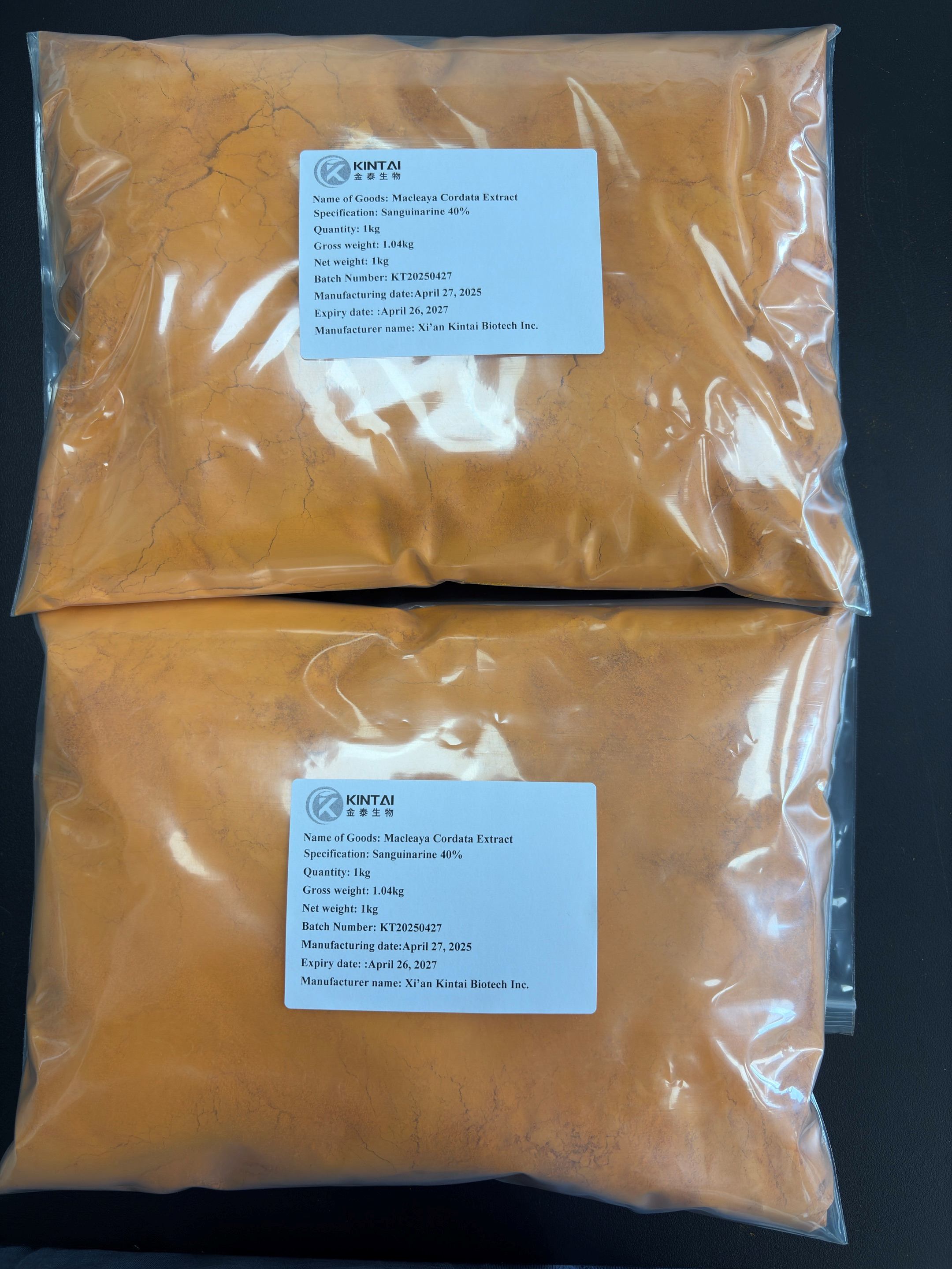 Healthkintai® stands as a leading producer of Macleaya Cordata Extract 60% total alkaloids( (Sanguinarine>40%,chelerythrine>15%). Through advanced extraction and purification technologies, we deliver pharmaceutical-grade quality, with the key bioactive compound Sanguinarine maintained in its core form, ensuring high bioavailability for diverse applications. Please feel free to contact us at health@kintaibio.com.