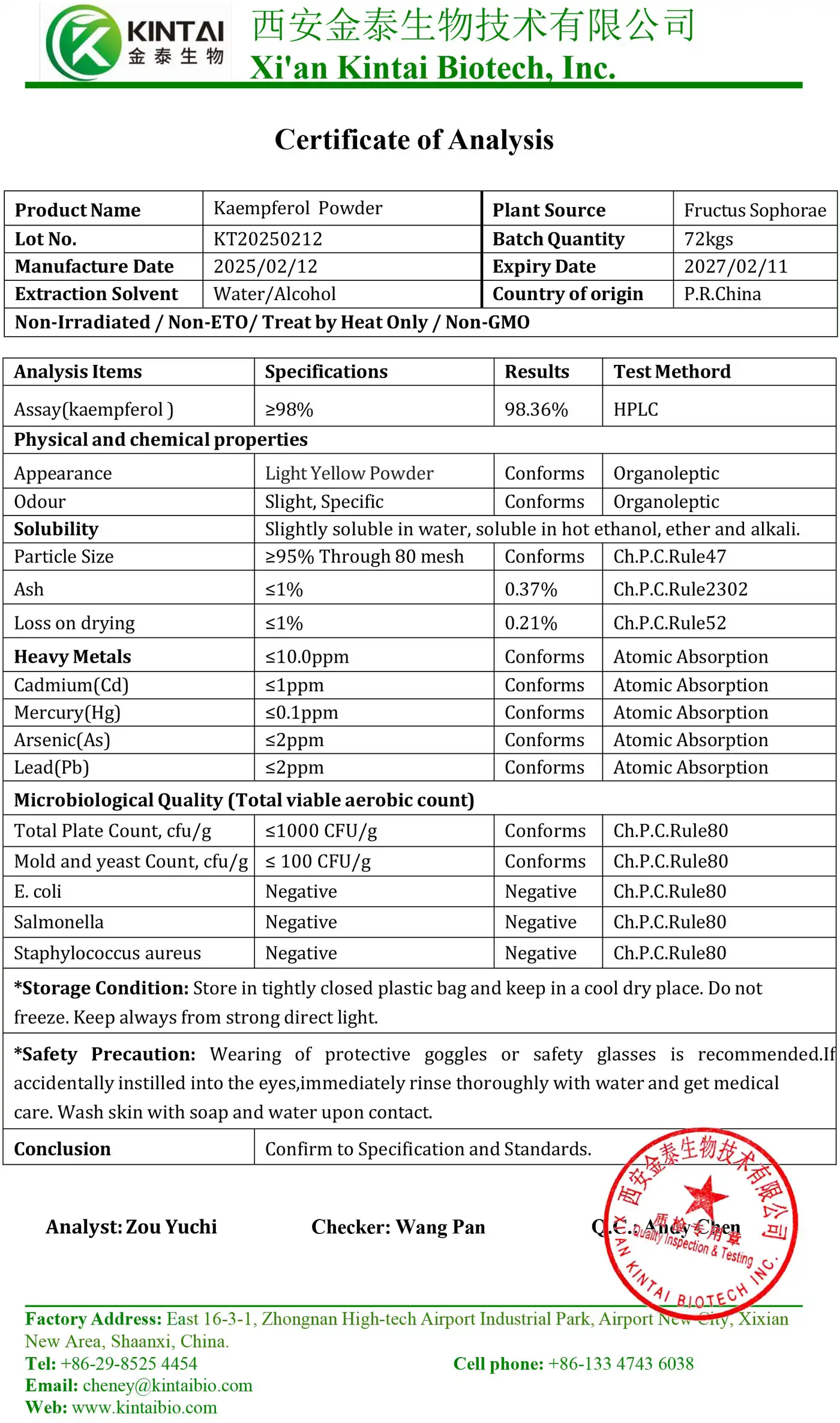 KINTAI Sophora Japonica Extract Powder stands out in the competitive market due to its superior specifications, rigorous quality control, and extensive certifications. Our product is available in high-purity grades of 50%, 95%, and 98% Kaempferol, ensuring versatility for nutraceutical, cosmetic, and pharmaceutical applications. Unlike many competitors, we employ HPLC/UV testing methods for precise quantification, guaranteeing batch-to-batch consistency and compliance with international standards such as GMP, ISO9001:2015, ISO22000:2018, HACCP, KOSHER, and HALAL35. Our extract is derived from Sophora japonica L. flower buds or fruits, carefully processed to retain maximum bioactivity while eliminating contaminants like pesticide residues.