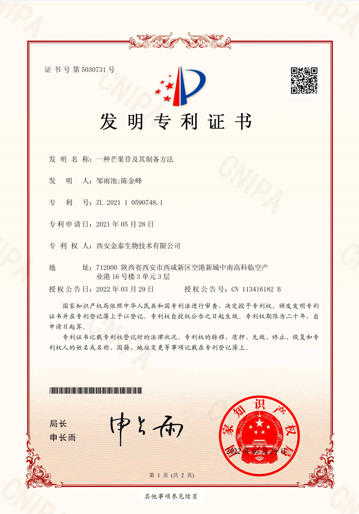 KINTAI Mangiferin Patent Certs
